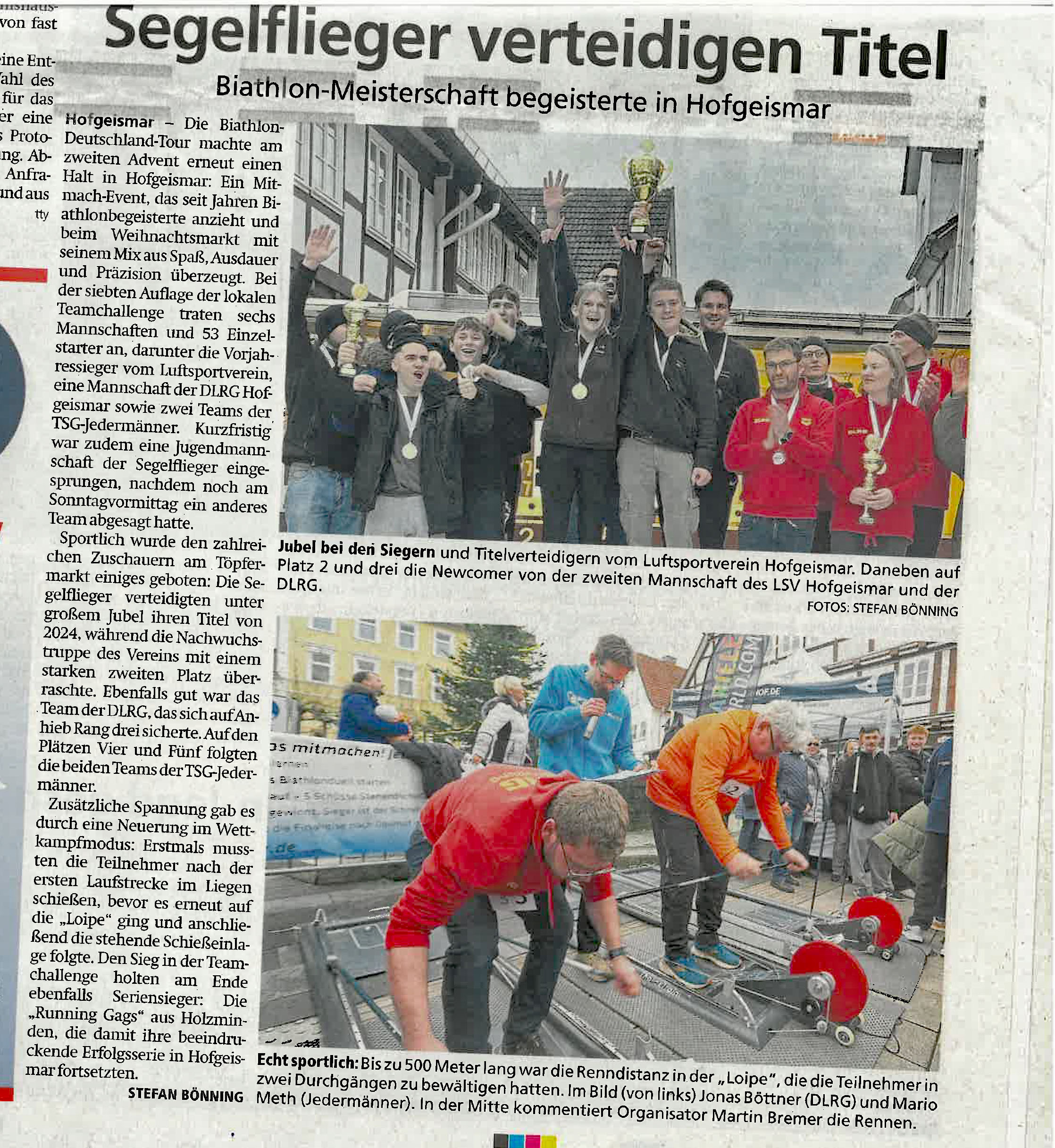 Der Rückstand für die vier Titelverteidiger hält sich in Grenzen (60 Sekunden), weil Maximilian Niederbremer mit 7 Treffern und schnellem Skilanglauf seine Vorlaufleistung um satte 38 Sekunden verbessert. Leider kann Martin Wagenknecht seine Vorlaufleistung mit 7 Treffern nicht wiederholen und muss nach 6 Fehlschüssen Running Gag Lena Timmermann ziehen lassen, die 9 von 10 Schüssen im Ziel unterbringt und hinter Papa und Bruder als beste Dame des Tages Platz 3 belegt. Linus Timmermann macht den Sieg der Running Gags perfekt, die nur 14:45 Minuten für den neuen Modus mit Liegend- und Stehendschießen benötigen (Im Vergleich: Am Vortag schaffte die seit Jahren überragende Staffel des SV Bieber Lendringsen beim Mendener Citybiathlon im gleichen Modus 14:24 Minuten. In Menden wären die Running Gags mit ihren 14:45 Minuten Zweite geworden). In Hofgeismar sind sie die Besten, doch um den Stadtmeistertitel kämpfen die Lokalmatadoren und da ist es ein Duell der beiden Teams des Luftsportvereins, das durch starke 3:20 Minuten und 6 Treffer von Michi Kupski für die Jungen Wilden kurzzeitig nocheinmal spannend wird, bis die erneut so großartig schießende Sina Junghans, wie im Vorjahr ihr Team des Luftsportvereins 1 als Schlussläuferin mit 8 Treffern und 4:10 Minuten im zweiten Jahr in Folge zum Biathlonstaffel-Stadtmeister-Titel führt. Im Vorlauf hatte Sina sogar 9 ihrer 10 Schüsse ins Ziel gebracht und damit als Viertbeste des Tages nur die 3 Überflieger aus Holzminden vor sich. Platz 2 der Staffel-Stadtmeisterschaft bringt der 1. Vorsitzende des Luftsportvereins, Christoph Danders, persönlich für seine Jungen Wilden nach Hause und macht damit die Segelflieger vom Dingel zum Maß der Dinge in Sachen Biathlon in Hofgeismar.
